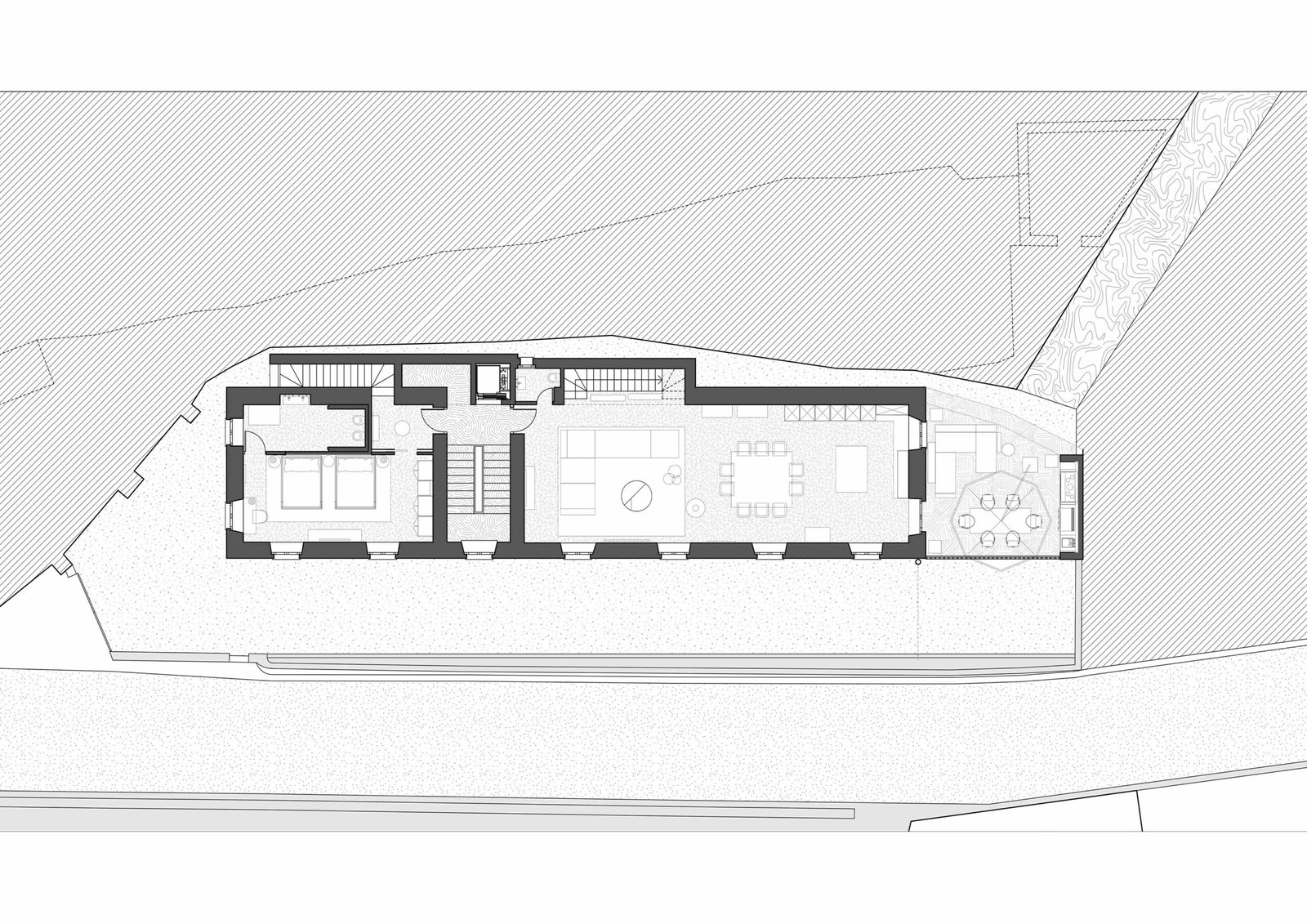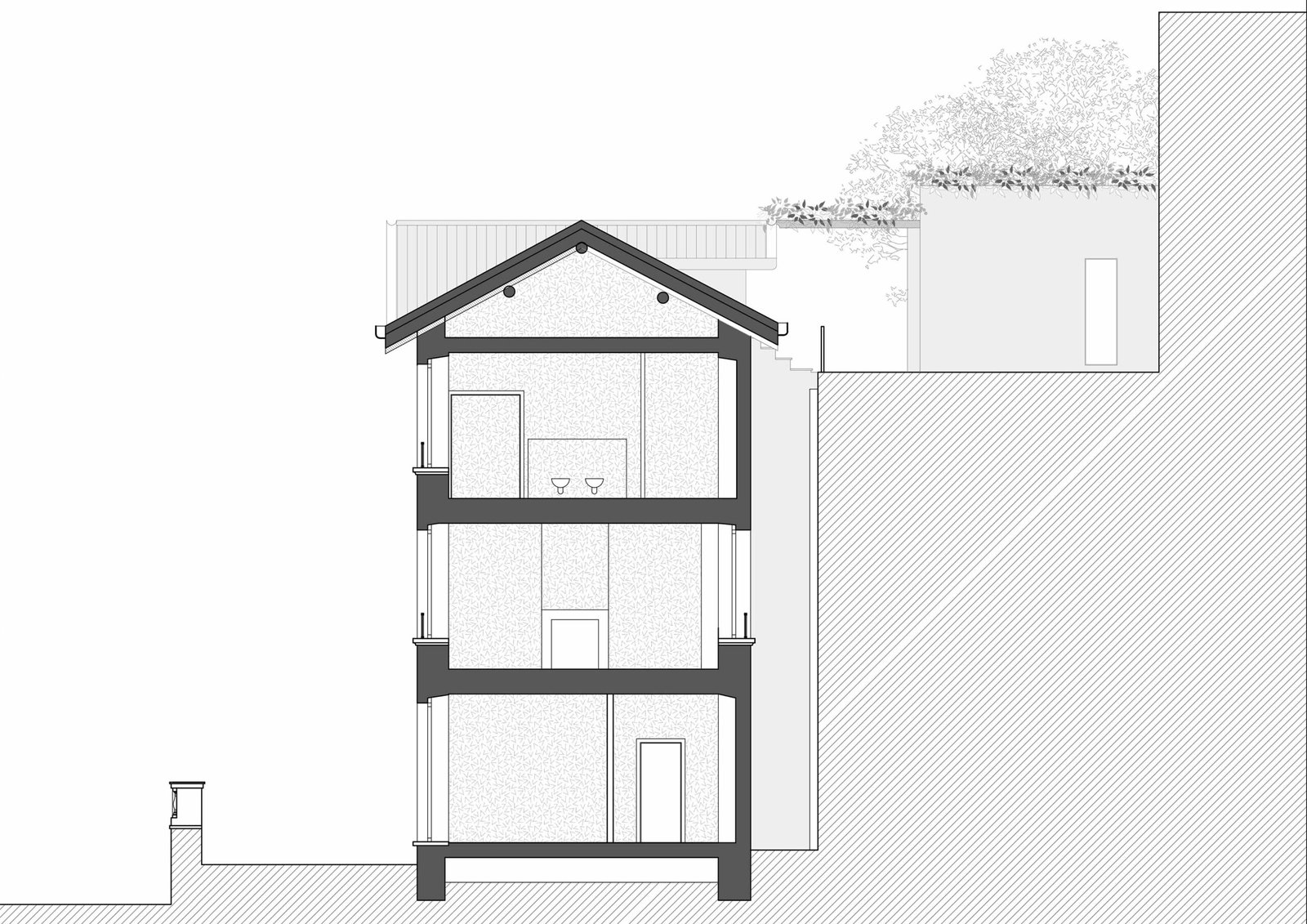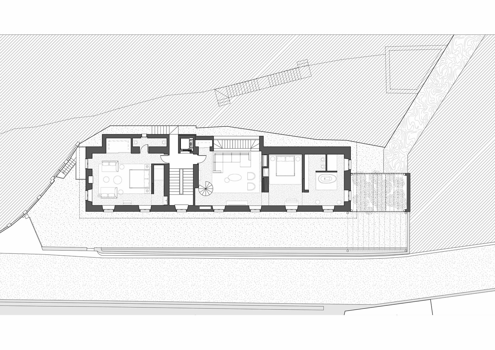 Data la morfologia longitudinale dell’edificio esistente, lo studio di architettura CarcanoStucchi propone di spostare dal corpo principale i sistemi di collegamento verticale - vano scala ed ascensore - all’esterno del volume originario. Venne così scavata la roccia retrostante il fabbricato permettendo di operare in tale spazio e guadagnare metrature e volumi necessari ad una più corretta e funzionale distribuzione degli spazi interni. Tale opera è risultata fondamentale per gli scopi che si erano prefissati ed è stata successivamente valorizzata per dare maggior carattere estetico anche agli spazi interni; difatti, dalla rampa di scale che collega la zona giorno alle camere, è stata collocata un’ampia vetrata in affaccio a tale parete rocciosa.