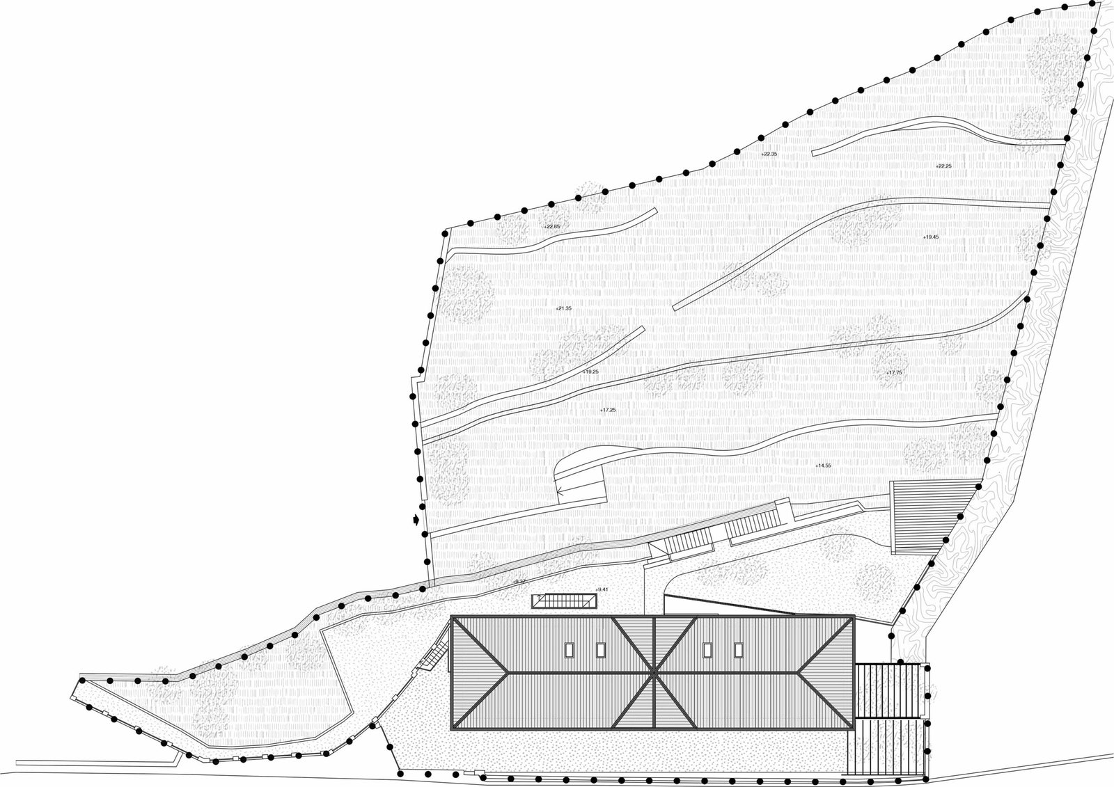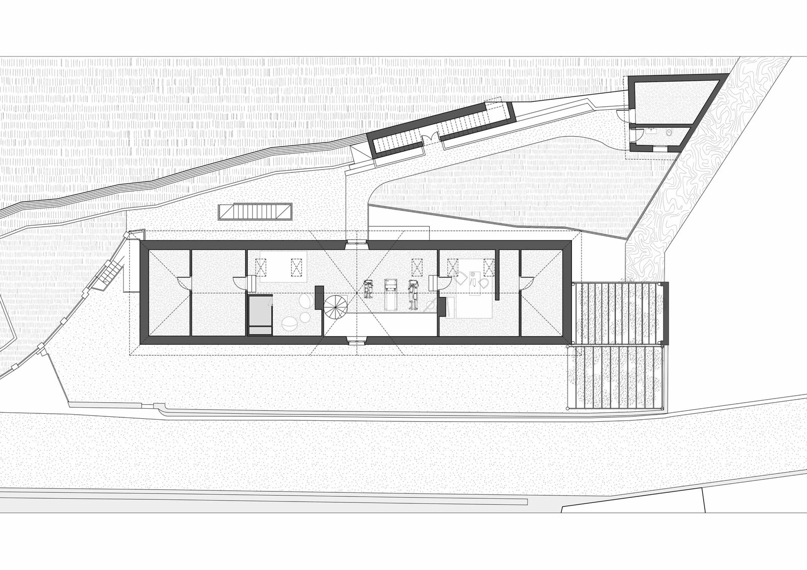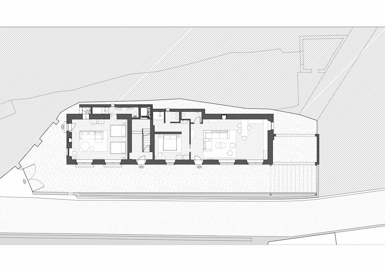 Data la morfologia longitudinale dell’edificio esistente, lo studio di architettura CarcanoStucchi propone di spostare dal corpo principale i sistemi di collegamento verticale - vano scala ed ascensore - all’esterno del volume originario. Venne così scavata la roccia retrostante il fabbricato permettendo di operare in tale spazio e guadagnare metrature e volumi necessari ad una più corretta e funzionale distribuzione degli spazi interni. Tale opera è risultata fondamentale per gli scopi che si erano prefissati ed è stata successivamente valorizzata per dare maggior carattere estetico anche agli spazi interni; difatti, dalla rampa di scale che collega la zona giorno alle camere, è stata collocata un’ampia vetrata in affaccio a tale parete rocciosa.